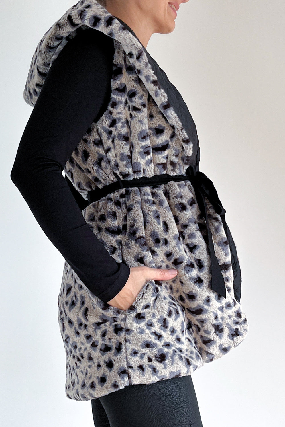 A pair of gray opriest sports maternity tights with a high waist, worn by a model standing sideways. The model is also wearing white boots with a lace-up front.